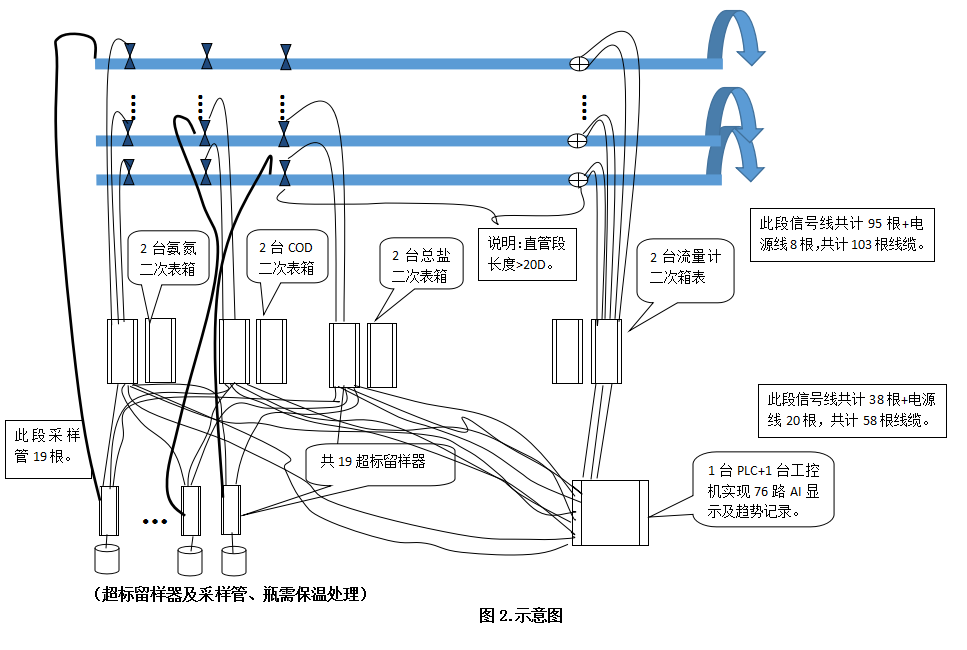 六、技術(shù)要求: 1測量設(shè)備的安裝:氨氮、COD(已招標(biāo),以后不再重復(fù))、總鹽、流量計(已安裝,以后不再重復(fù))以及取水口分別科學(xué)、合理的安裝于污水管道上(如圖2.)。 2、二次表:氨氮二次表(兩個儀表箱)、COD二次表(兩個儀表箱)、總鹽二次表(兩個儀表箱)、以及流量計二次表(兩個儀表箱)分別放在相應(yīng)儀表箱內(nèi)。 3、節(jié)點信號:氨氮二次表、COD二次表、總鹽二次表分別提供超標(biāo)的節(jié)點信號,以及流量計二次表提供斷流的節(jié)點信號給留樣器。 4、留樣器(已招標(biāo),以后不再重復(fù)):設(shè)計安裝19路超標(biāo)留樣器,針對每條污水管線任何超標(biāo)現(xiàn)象,進行采樣留存。 5、采樣要求:流量計無流量,停止采樣;氨氮、COD、總鹽的其中任何一個指標(biāo)超標(biāo),啟動超標(biāo)留樣器進行采樣留存。 6、工控機(PLC):實現(xiàn)集中顯示以及實現(xiàn)歷史記錄查詢,并完成月報、年報。 7、短信提醒:超標(biāo)采樣的同時,發(fā)送手機提醒信息,說明是哪一路管線及何種指標(biāo)超標(biāo)采樣。 8、趨勢要求:集中實時數(shù)據(jù)顯示及歷史趨勢記錄顯示,歷史趨勢顯示方式為曲線型。 9、手機顯示:實現(xiàn)手機無線信號接收,集中實時顯示及趨勢記錄顯示。 10、房屋要求:乙方方提出房屋面積、保溫、防水等要求。 11、伴熱保溫要求:乙方完成合理的管線保溫伴熱的施工方案及材料清單。 12、乙方需安排專人進行現(xiàn)場指導(dǎo)安裝。 13、詳見圖1.現(xiàn)場照片及圖二.初步安裝示意圖。 七、對投標(biāo)單位及投標(biāo)文件的要求: 1. 企業(yè)簡介 2. 營業(yè)執(zhí)照復(fù)印件(蓋公章) 3.法人身份證復(fù)印件及或代理人身份證復(fù)印件(蓋公章) 4.代理人委托書。 5. 主要業(yè)績(三年內(nèi)同等規(guī)模)(蓋公章) 6. 一年內(nèi)銷售合同(復(fù)印件蓋公章)。 7.投標(biāo)書中需包含有投標(biāo)方對所投標(biāo)設(shè)備的檢驗、試驗及驗收標(biāo)準(zhǔn)的詳細敘述。 8.投標(biāo)書中需包含有投標(biāo)方對所投標(biāo)設(shè)備的設(shè)備性能保證方案的詳細敘述。 9.投標(biāo)單位可以在甲方提供的設(shè)計數(shù)據(jù)基礎(chǔ)上,提前與甲方溝通,征得甲方技術(shù)人員同意,優(yōu)化方案,但必須滿足相關(guān)國家或行業(yè)標(biāo)準(zhǔn)、規(guī)范。 10.甲方從相關(guān)投標(biāo)方中選擇質(zhì)量有保證、價格合適、既節(jié)能又經(jīng)濟的方案與供貨方合作。 八.設(shè)備的質(zhì)保及服務(wù)內(nèi)容 九.需報出設(shè)備的制作周期及交貨方式 十、投標(biāo)截止日期:2018年 3月16日18 時 開標(biāo)時間: 2018年3 月20 日 9:30 時 開標(biāo)地點: 綠源公司一樓會議室 十一、聯(lián)系人:尹工 17733798538 滄州綠源水處理有限公司